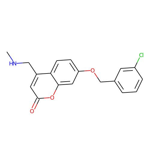 | Smiles | CNCc1cc(=O)oc2cc(OCc3cccc(Cl)c3)ccc12 |
