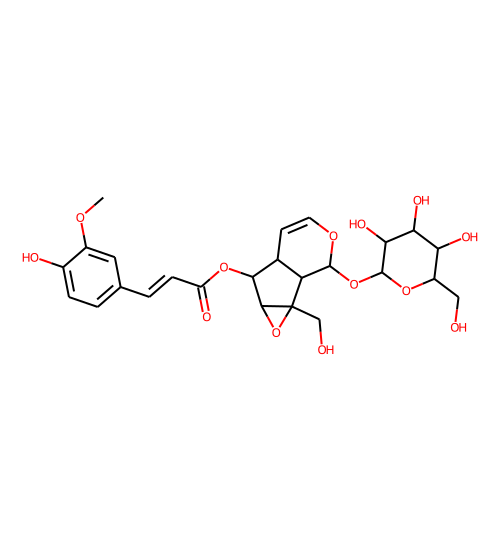| Smiles | COc1cc(C=CC(=O)OC2C3C=COC(OC4OC(CO)C(O)C(O)C4O)C3C3(CO)OC23)ccc1O |